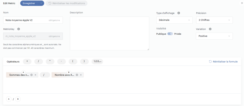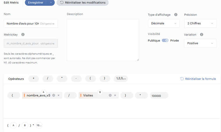 Et on peut même aller plus loin en mixant dans une métrique calculée des données analytics et des données issues de measurements : imaginons que je souhaite suivre le nombre d’avis laissés pour 10 000 visites sur mon app . Il me suffit alors de diviser le nombre d’avis par le nombre de visites et de multiplier le tout par 10 000 dans une métrique calculée :