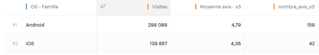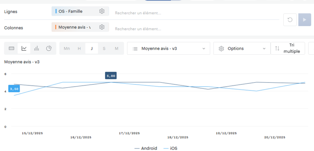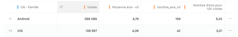 {"site_id": 634856, "key": "nombre_avis_...On crée à nouveau une métrique calculée pour diviser les 2 valeurs et on obtient un magnifique graphique qui affiche l’évolution des notes sur les 2 OS :