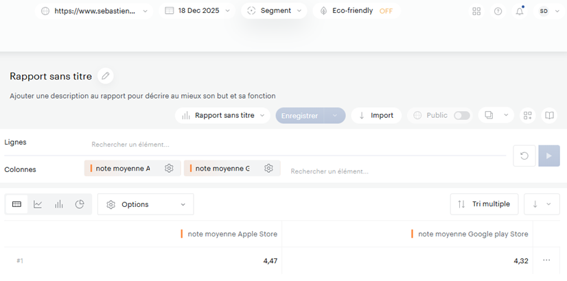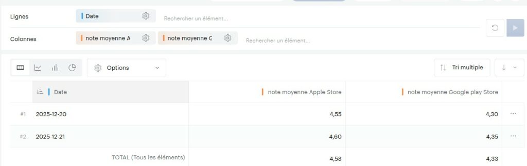 Je suis donc maintenant clairement beaucoup plus positif vis-à-vis de cette fonctionnalité, qui peut s’appliquer dans de nombreux use cases, et je souhaite vous présenter à travers cet article un cas permettant d’exploiter l’ensemble des possibilités offertes par les measurements : la création d’un board contenant les données quantitatives et qualitatives des avis de votre application sur le Google Play Store et l’Apple Store :
