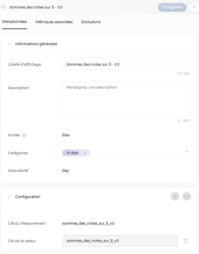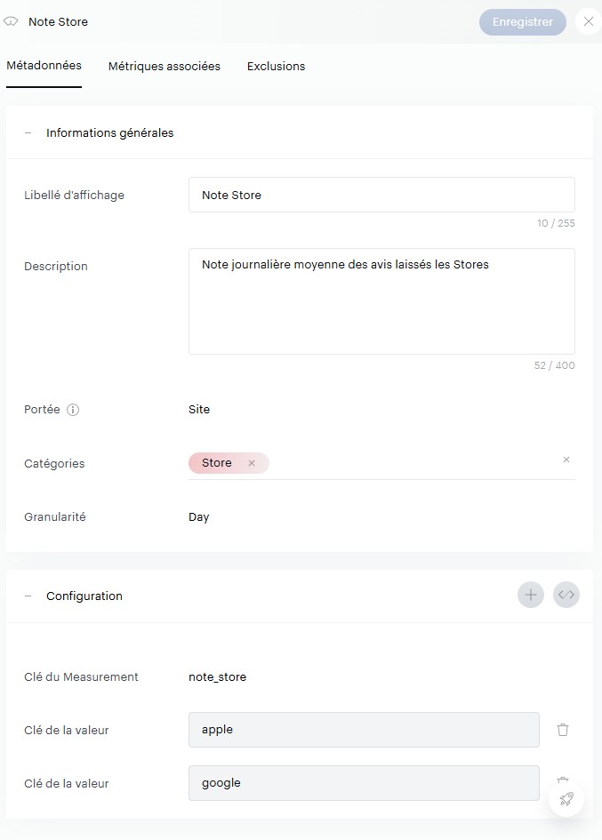 À noter que vous pouvez définir plusieurs métriques pour une clé donnée, afin de faire par exemple une agrégation via une moyenne dans un cas, et une autre via une somme dans un autre .