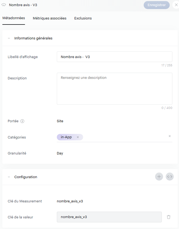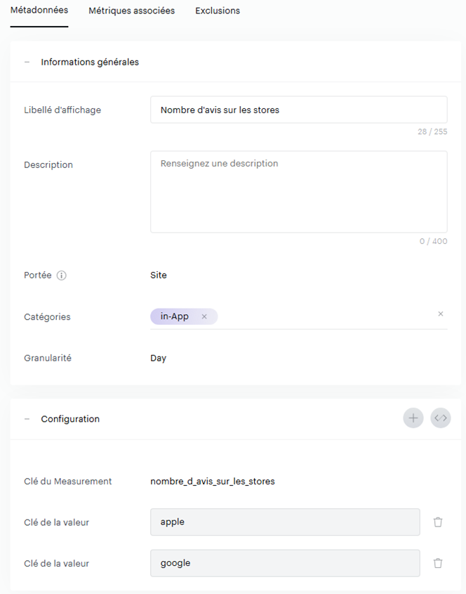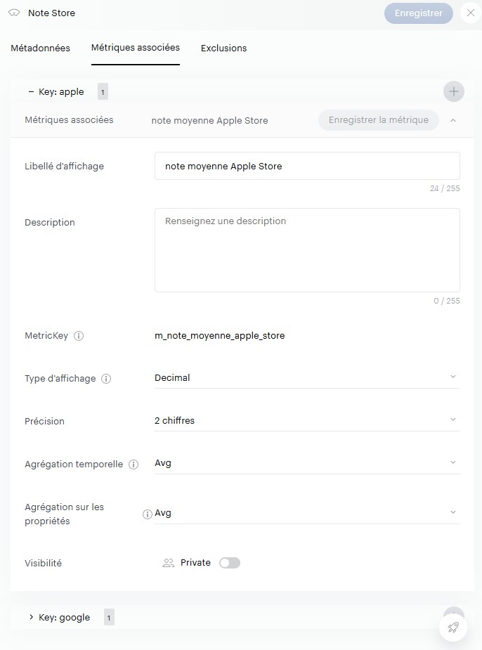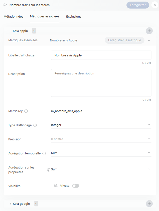 appleetgoogle. - Finalement, vous devez configurer des « métriques », qui décrivent la manière dont sera restituée votre clé. Est-ce un nombre ou du texte ? Doit-on sommer ou faire une moyenne des valeurs journalières quand on sélectionne 1 semaine de données dans le calendrier Piano ?