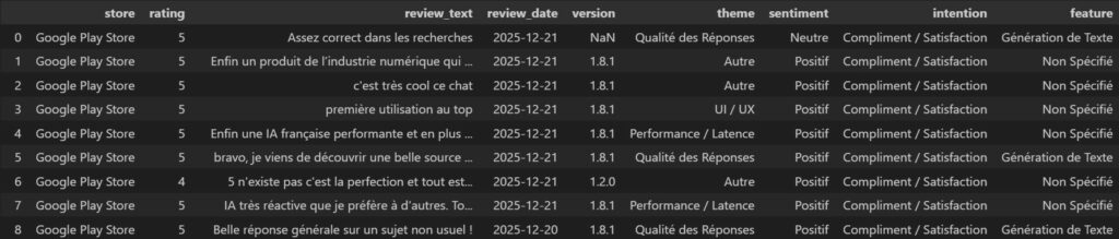 Sa méthode d’extraction et d’enrichissement fait écho à mon article précédent, que je vous conseille vivement de consulter si vous souhaitez comprendre toute la machinerie en détail, mais pour faire très simple : un script python va exploiter des librairies Python et des API ouvertes pour récupérer les avis ainsi que quelques informations de contexte (date, version de l’app), fusionner les 2 stores dans un seul tableau, puis envoyer les avis à l’API de Gemini pour enrichir le data set avec des informations qualitatives :