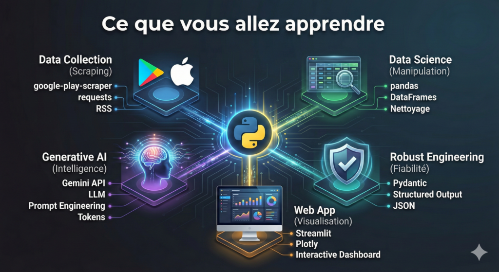 Mon objectif dans cette vidéo est de vous montrer comment exploiter concrètement l’IA via Python pour extraire des données qualitatives non structurées. Ces données sont ensuite transformées en tableaux de bord exploitables (utilisant Streamlit et Plotly) et enrichies par des analyses générées par un LLM (Gemini). Le tout s’accompagne d’une exploration des aspects techniques nécessaires, notamment la récupération de données via des API ou des outils de scraping.