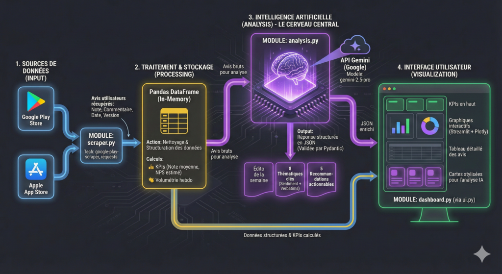 3. Enrichissement par l’IA et Dashboarding : Les données préparées sont soumises à l’API de Gemini (un LLM) pour en tirer des insights qualitatifs. Ces résultats, combinés aux statistiques traditionnelles, sont affichés dans un tableau de bord interactif créé avec Streamlit et des visualisations Plotly